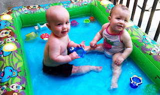 This month brought some other firsts as well. The babies went swimming at Aunt Jenny's neighborhood pool and also splashed around in Melody's pool during our Pittsburgh visit. They loved hanging out in their floaties and playing with toys in the water. They also went on their first swing at Nana and Pop's house. John had so much fun he fell asleep. That boy falls asleep whenenver there is any kind of motion! The babies are also enjoying their finger foods. Their favorite is Cheerios! Anna loves cottage cheese, shredded cheese, diced peaches, and turkey. John is not as eager as his sister to eat these new foods. Next month is sure to hold more firsts and accomplishments!! It is so much fun watching Anna and John discover their new world :)